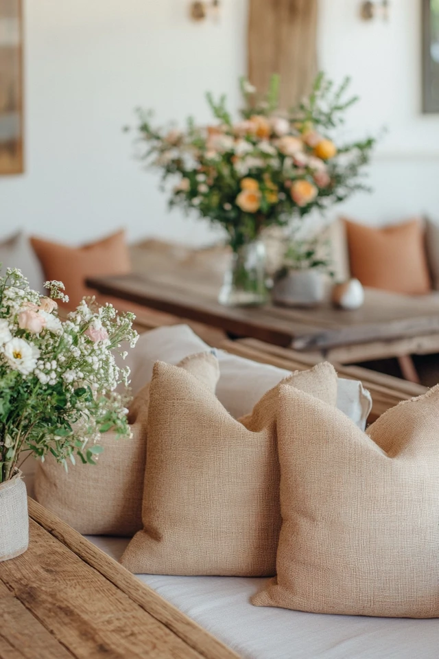- Why It Works: Burlap adds texture and a rustic edge to soft furnishings.