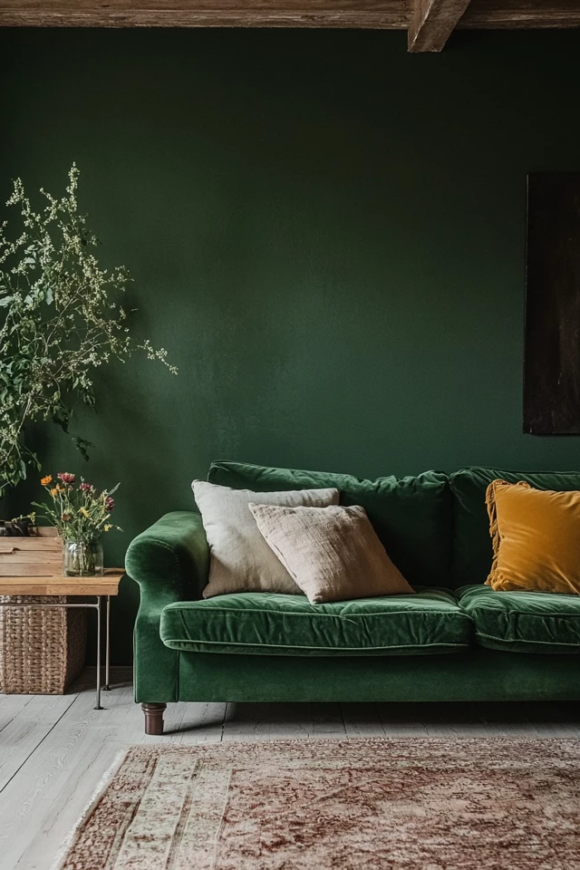 A deep emerald green accent wall behind a bed can create a dramatic yet calming focal point.