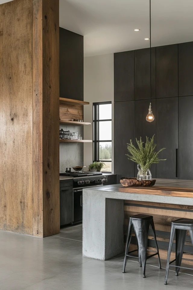 I fell in love with this pairing during a kitchen renovation project. I had a polished concrete countertop installed but felt the space needed some warmth to balance its stark modernity. Adding reclaimed wood open shelving and a natural wood island base transformed the room. Suddenly, the space felt grounded yet dynamic, rugged yet inviting. It was the perfect mix of industrial edge and natural warmth.