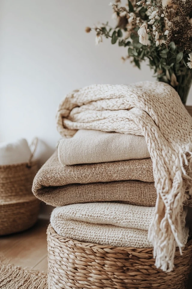 Imagine a living room with white walls and light wood floors. A soft wool throw draped over a linen sofa adds a layer of warmth, while a jute rug anchors the seating area. A woven rattan pendant light hangs overhead, casting a warm glow, and a wicker basket by the fireplace holds extra blankets. These natural fiber elements not only enhance the room’s aesthetic but also make it feel more tactile and lived-in.