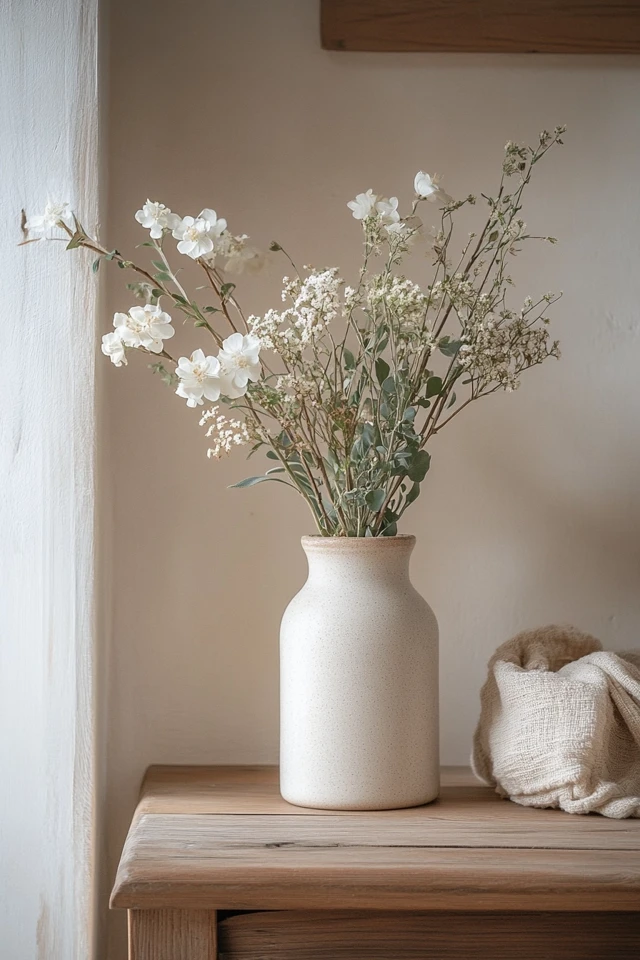 - Add life to your space with houseplants, eucalyptus stems, or faux greenery. The organic green tones pair beautifully with neutral backdrops.
