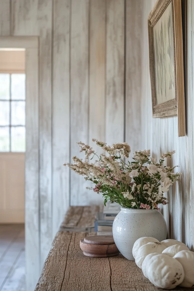 Whitewashed surfaces work best with a neutral or pastel color palette. Think shades of cream, gray, sage green, or soft blue.