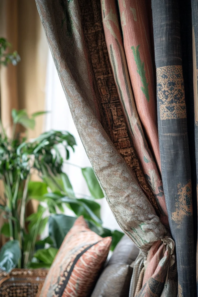 - Select outer drapes with bold patterns, rich textures, or vibrant colors. Look for global-inspired prints like ikat, paisley, or Moroccan motifs to enhance the boho aesthetic.