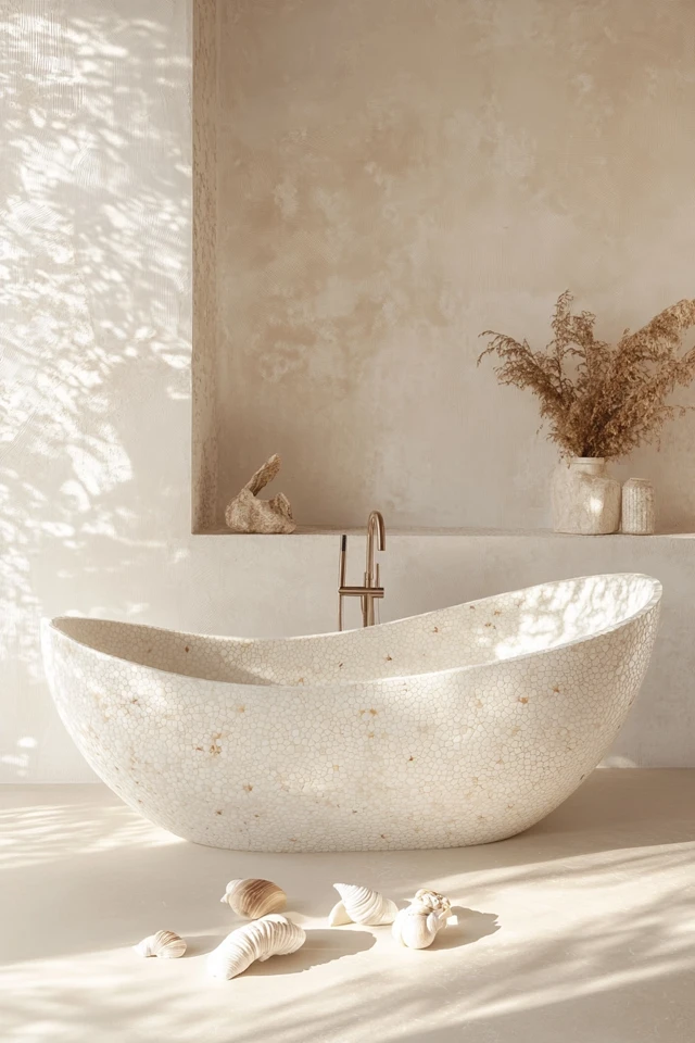 Seashell patterns on towels, rugs, or shower curtains add a soft, coastal vibe without overwhelming the space.