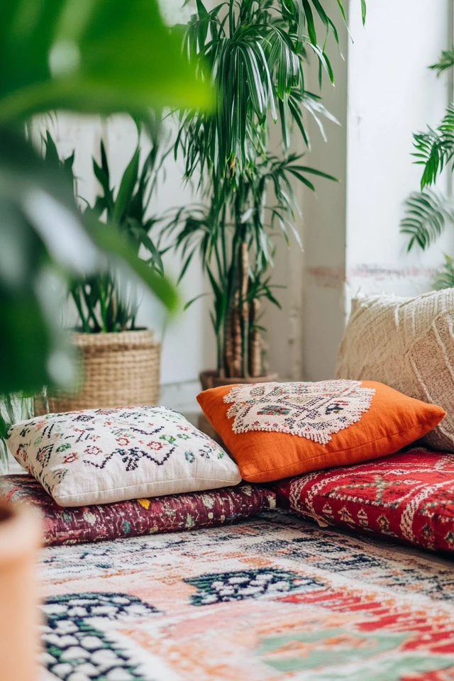- Why It Works: Layering cushions of different sizes and shapes adds dimension and creates a sense of abundance, key to boho design.