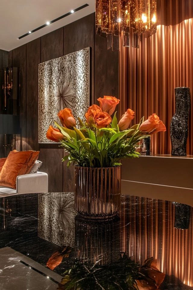 - Include metallic vases, trays, or candlesticks for smaller accents.