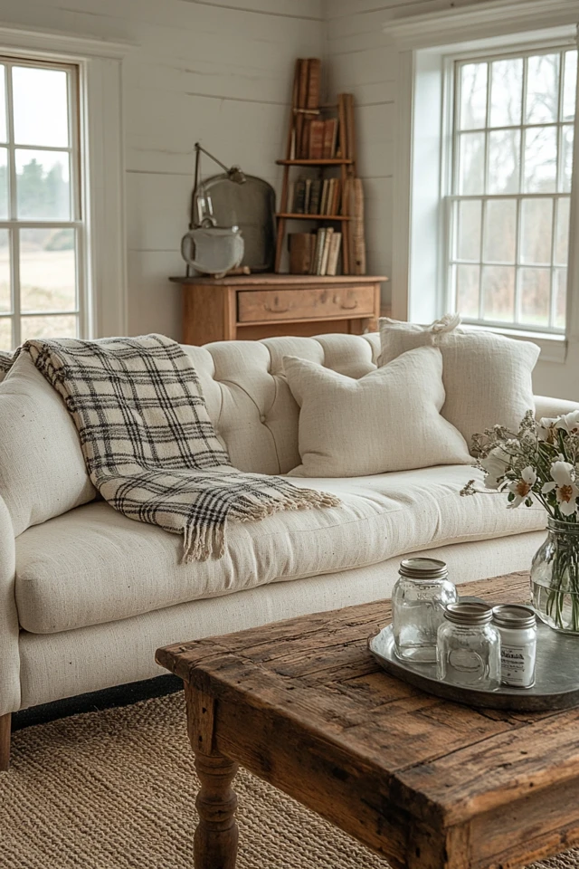 - Slipcovered Sofas: Opt for soft, neutral slipcovered sofas for an effortless, cozy farmhouse look.