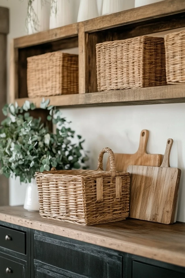 - Baskets on Shelves: Organize detergents, clothespins, and cleaning supplies in labeled wicker baskets.