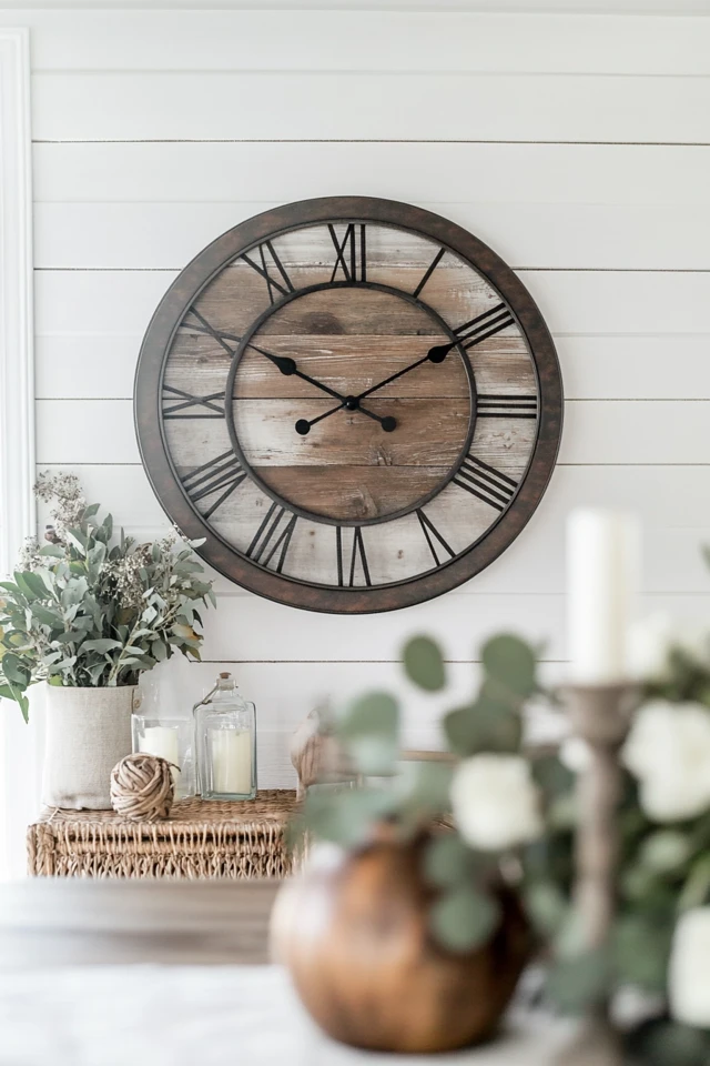 - Natural Elements: Pair wooden or distressed clocks with greenery, like eucalyptus garlands or potted plants.