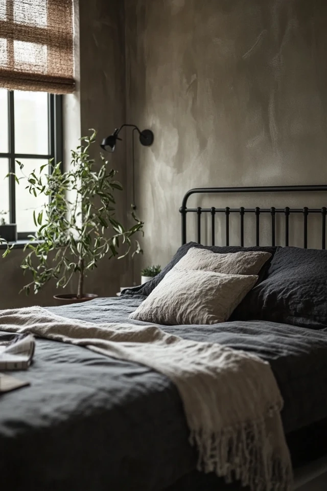 Use plush bedding, throw pillows, and cozy rugs to add warmth and contrast to the raw materials.