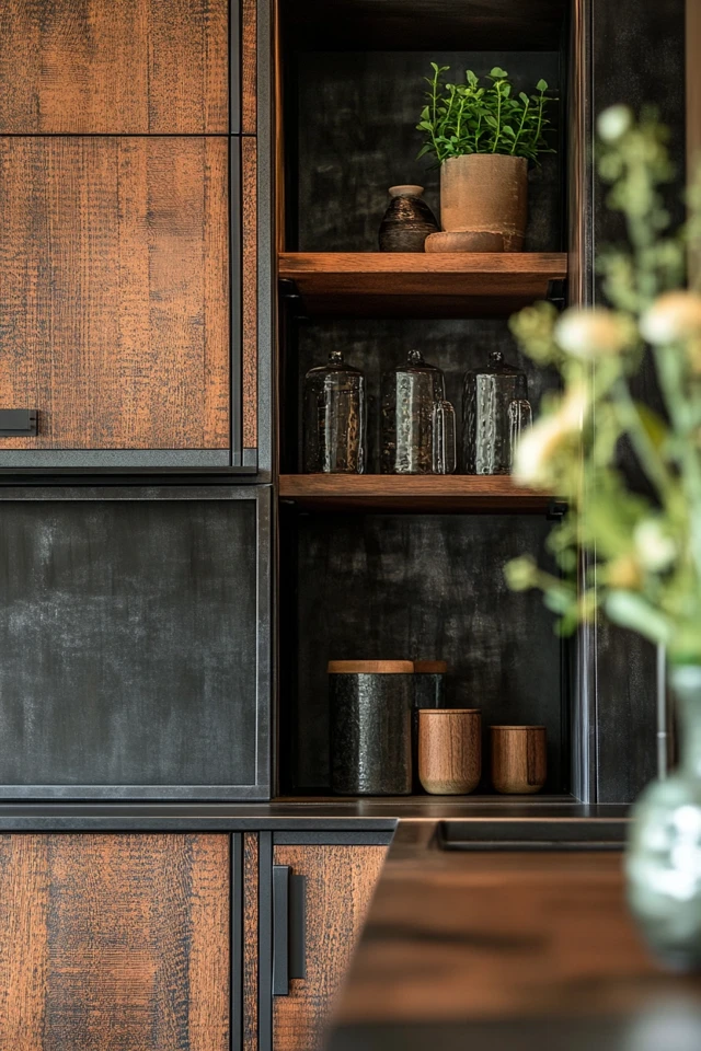 Use decor like vintage books, plants, or metal sculptures to enhance the industrial vibe of your cabinets.