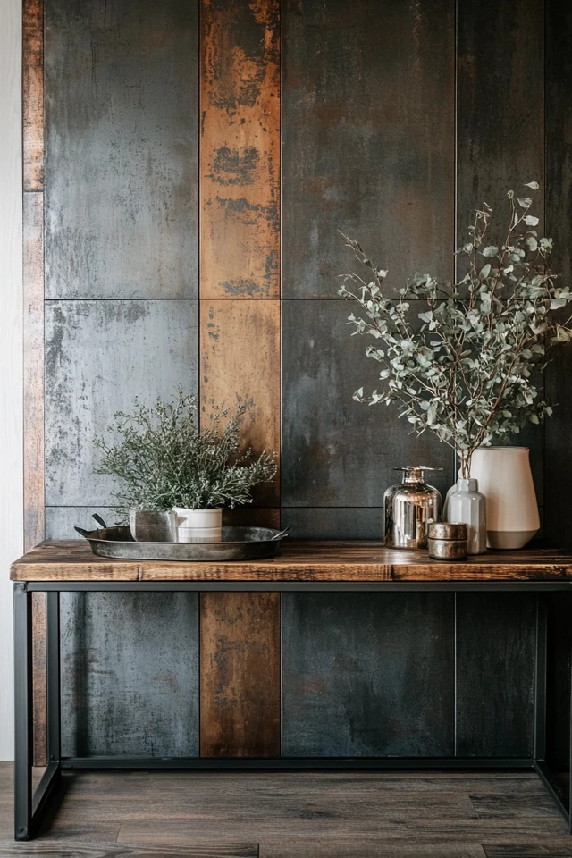 For a modern industrial vibe, opt for a console table with a concrete or faux-concrete top.