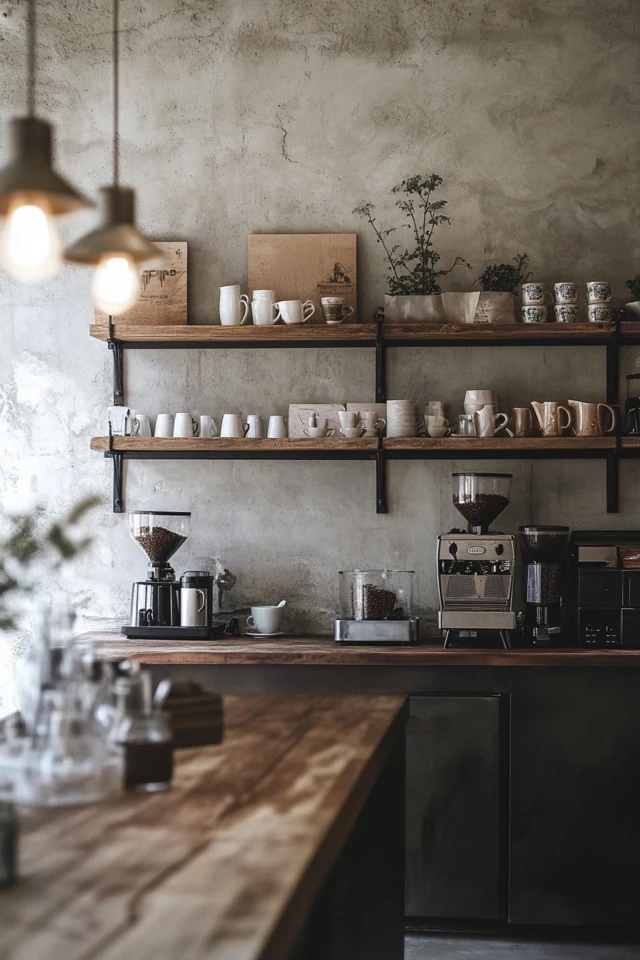 - Why It Works: The exposed pipes reinforce the industrial aesthetic, while the shelves provide ample space for your coffee gear.