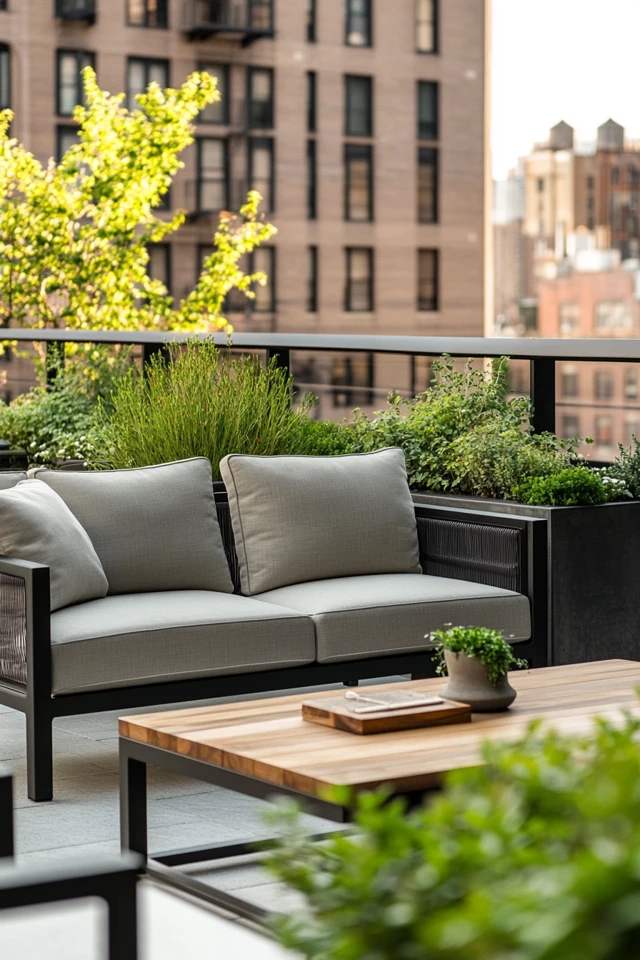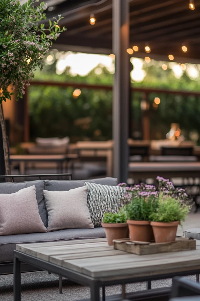 Use a modular sectional sofa with concrete accent tables to create a lounge-worthy retreat. Decorate with outdoor pillows and greenery for a touch of softness.