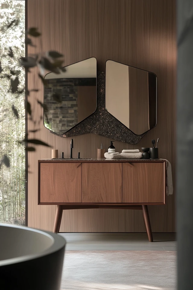 A double mid-century vanity is both functional and stylish, offering plenty of storage and counter space for shared bathrooms.