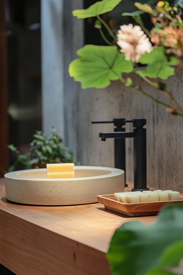 Top Pick: A gray or beige stone vessel sink paired with a wall-mounted faucet creates a harmonious balance of modernity and nature.