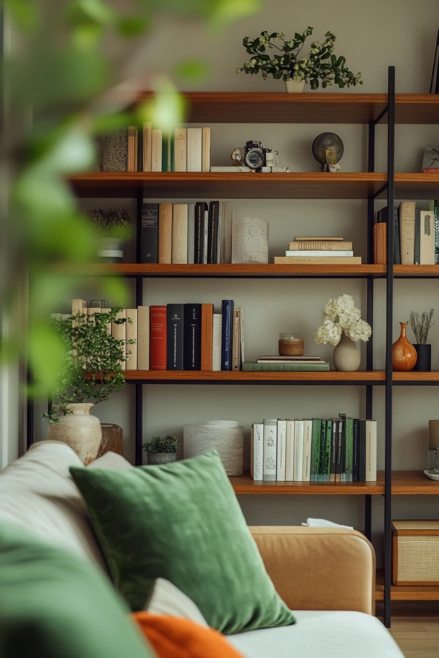Incorporate plants, such as trailing pothos or small succulents, to bring life and warmth to the shelves.