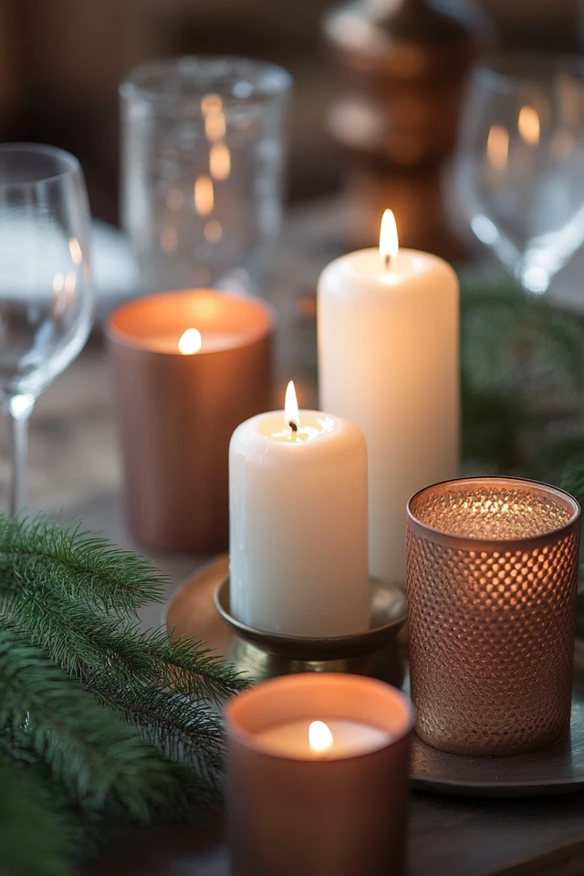 - Winter: Use white, gold, or silver candles for a festive feel. Add greenery, fairy lights, or faux snow for a holiday display.