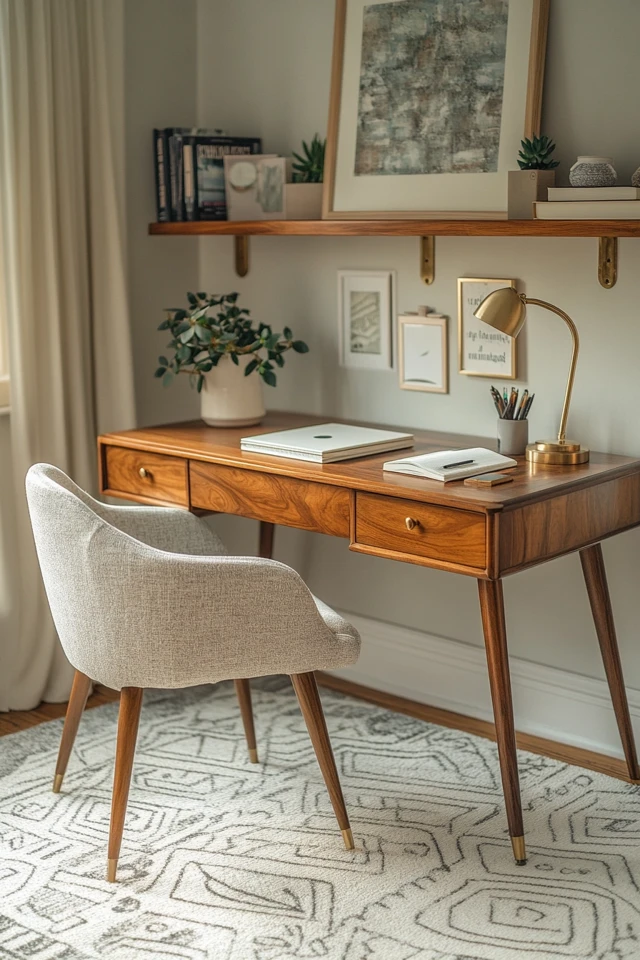 For me, designing my mid-century modern workspace wasn’t just about aesthetics—it was about creating an environment where I could focus, stay organized, and feel truly at home. Every detail, from the tapered legs of my desk to the brass lamp on its surface, contributes to a space that’s both beautiful and functional.