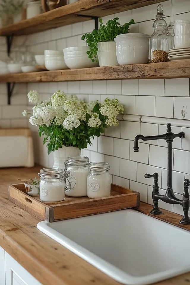 Pro Tip: Keep shelves styled but uncluttered—display practical items like white dishes, mugs, and glass jars.