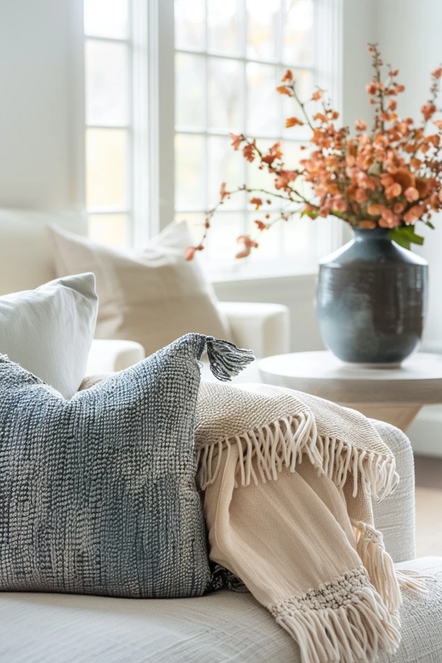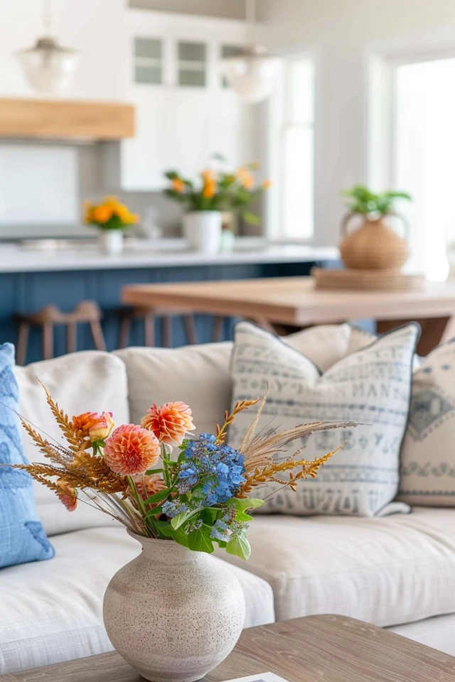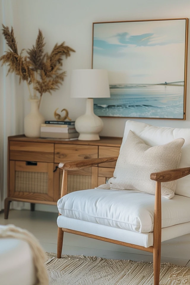 Light and Airy Colors: Start with a base of whites and beiges for walls and larger furniture pieces. Add accents of soft blues and seafoam greens through throw pillows, rugs, and decorative items.