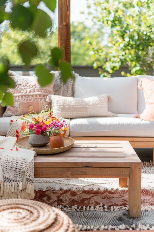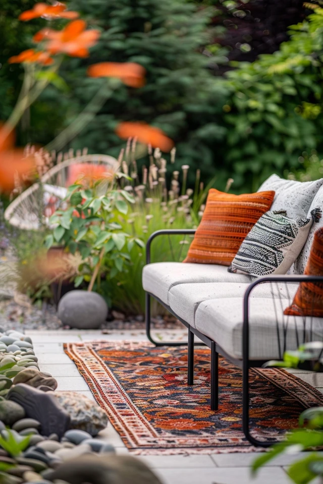 - Layered Rugs: Use outdoor rugs to define seating areas and add warmth and texture. Layer rugs for a rich, bohemian look.