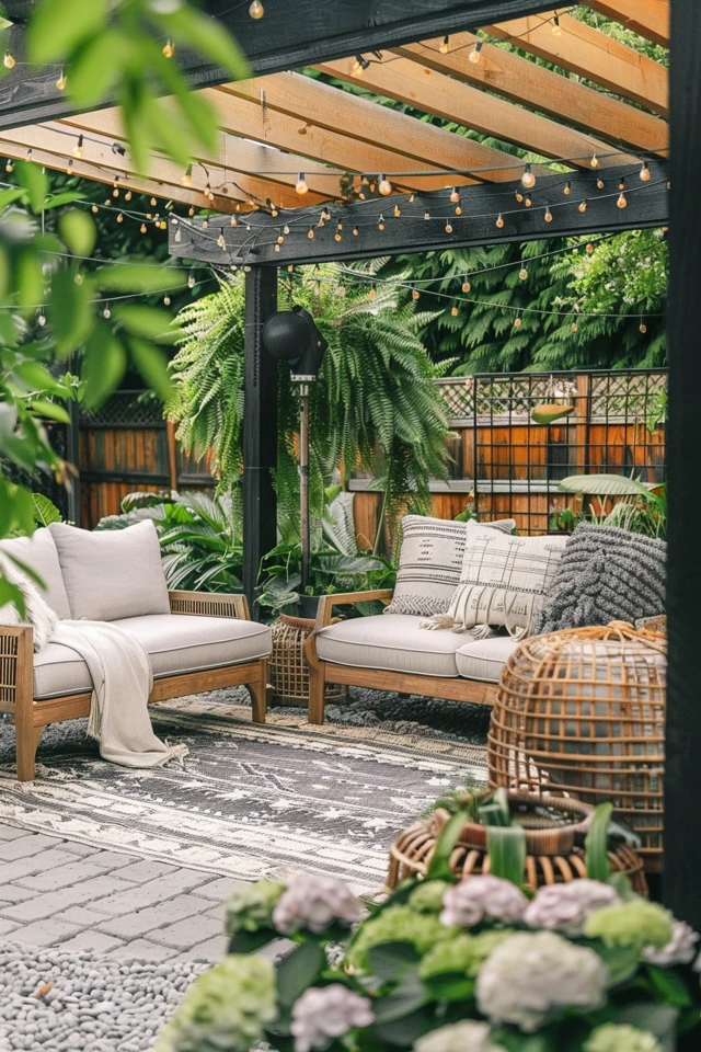 - Dining Area: Set up a dining area with a table and chairs. Use a pergola or umbrella for shade, and add string lights or lanterns for evening meals.