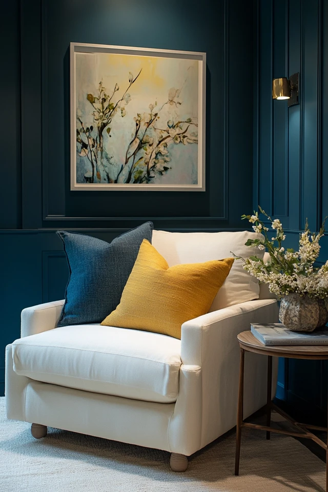 - Example: A living room with a navy accent wall, neutral furniture, and mustard pillows feels both sophisticated and inviting.